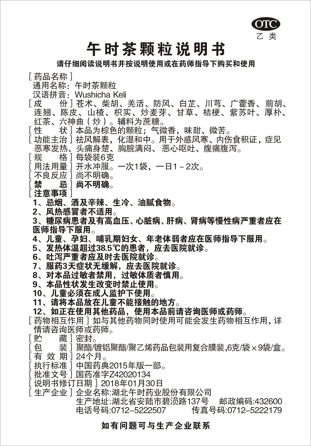 蒼術、柴胡、羌活、防風、白芷、川芎、廣藿香、前胡、 連翹、陳皮、山楂、枳實、炒麥芽、甘草、桔梗、紫蘇葉、厚樸、 紅茶、六神曲(炒)。輔料為蔗糖。